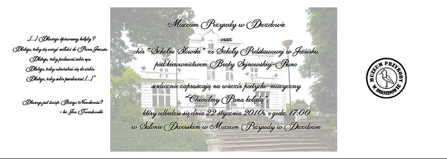 Muzeum Przyrody w Drozdowie oraz chór "Szkolne słowiki" ze Szkoły Podstawowej w Jeziorku pod kierownictwem Beaty Sejnowskiej-Runo serdecznie zapraszają na wieczór poetycko-muzyczny "Chwalmy Pana kolędą", który odbędzie się dnia 22 stycznia 2010 r. o godzinie 17.00 w Salonie Dworskim w Muzeum Przyrody w Drozdowie.
