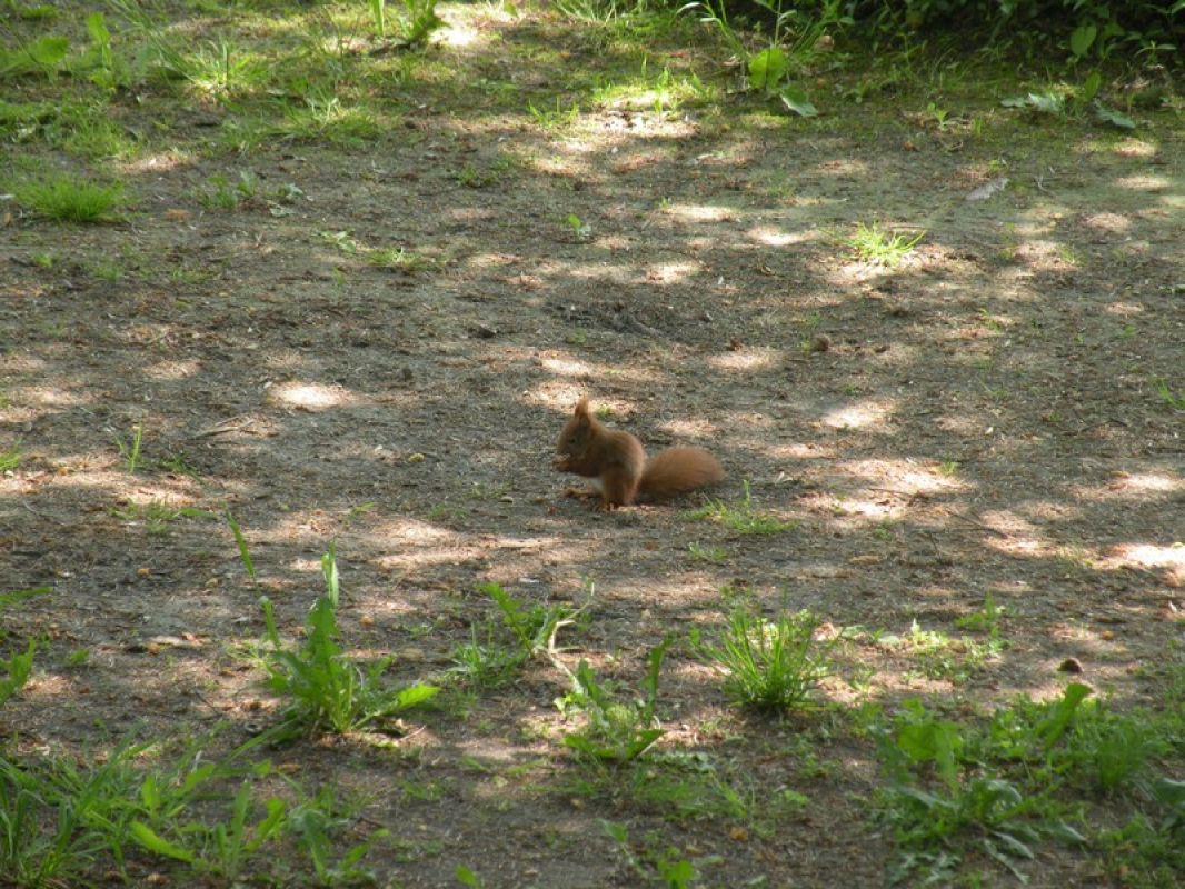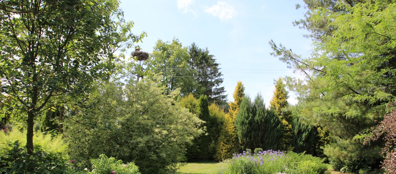 Na słupie uwił sobie gniazdo bocian. Powraca tu na wiosnę już od prawie 10 lat. Zaglądają tu chętnie wiewiórki wprawiając w zdziwienie i bojowy nastrój kotkę oraz psa.