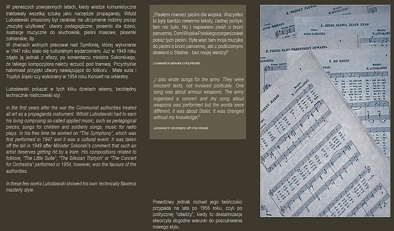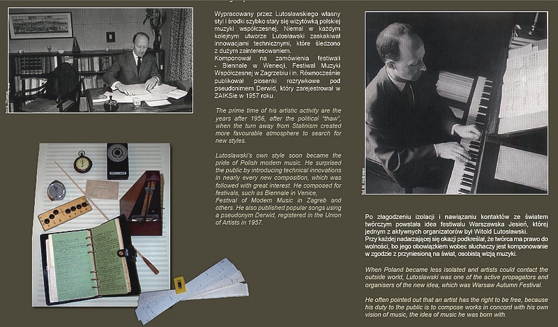 Dzięki temu zwiedzający wystawę mają okazję obejrzeć zdjęcia i zapoznać się z materiałami wcześniej nie publikowanymi. Wystawa informuje również o działalności charytatywnej kompozytora, która za życia Witolda Lutosławskiego była na jego życzenie nie nagłaśniana.